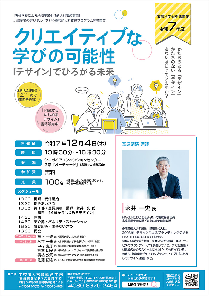 2025年12月4日(木)に クリエイティブな学びの可能性 ~「デザイン」でひろがる未来~ をテーマとして、セミナー(基調講演及びパネルディスカッション)を開催いたします。